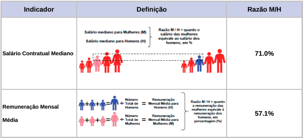 O salário contratual mediano das mulheres equivale a 71.0% do recebido pelos homens.